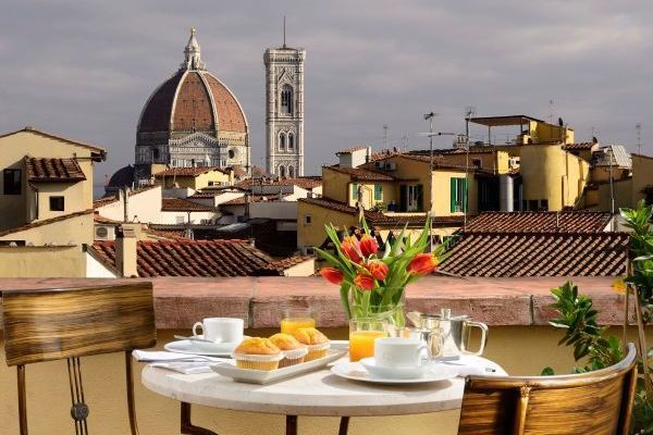 Al quarto piano, la sala colazione accoglie gli ospiti in un’autentica loggia rinascimentale con vista mozzafiato sulla Basilica di Santa Maria Novella. Al piano terra, il lounge bar è il luogo ideale per rilassarsi in qualsiasi momento della giornata con un drink o un pasto leggero grazie ad un'illuminazione intima e soffusa caratterizzato da un grande balcone centrale in mogano e confortevoli salottini con poltroncine e tavolini in legno. La struttura propone un menù ricercato, inclusa la possibilità di pasti Gluten-Free, realizzato attraverso prodotti di eccellenza della cucina italiana e toscana in particolare