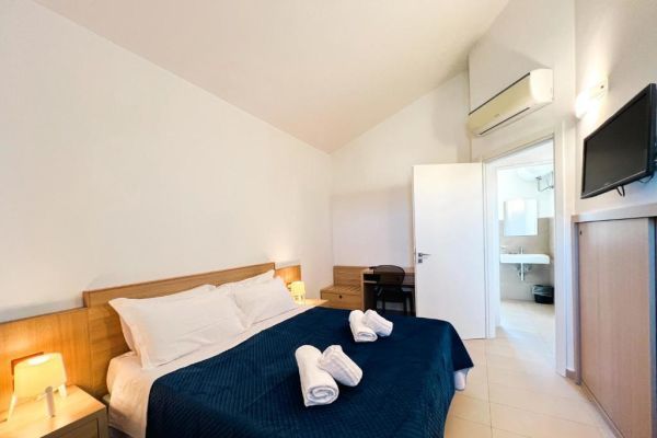 Gli appartamenti del Residence Archimede sono spaziosi, accoglienti e arredati con gusto per offrire un soggiorno confortevole e senza pensieri. Ogni unità è dotata di camere ampie, bagno privato, aria condizionata e angolo cottura (utilizzabile solo in formula residence), garantendo tutto il necessario per un’esperienza rilassante e pratica.